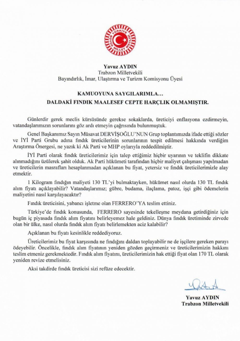 İYİ Parti olarak fındık üreticilerimiz için talep ettiğimiz hiçbir uyarının ve teklifin dikkate alınmadığını üzülerek şahit olduk. Ak Parti hükümeti tarafından hiçbir maliyet çalışması yapılmadan ve üreticilerin masrafları hesaplanmadan açıklanan bu fiyat, yetersiz ve fındık üreticilerimizle alay etmektir.