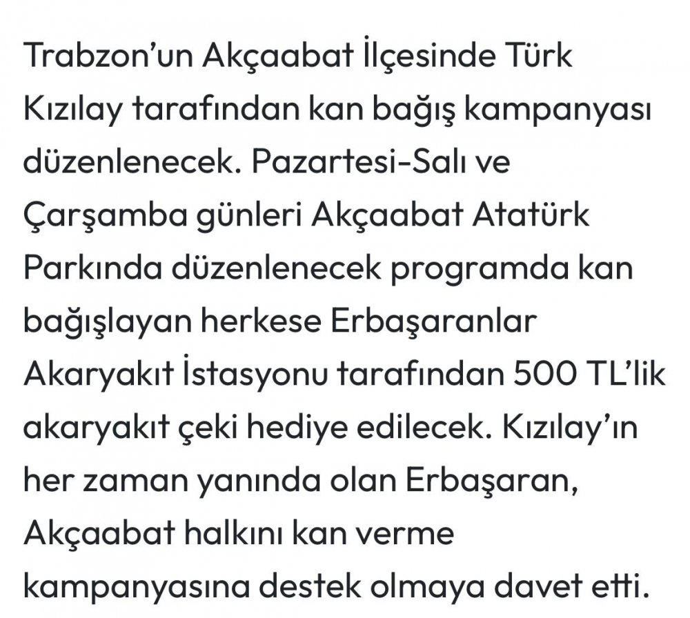 Erbaşaran kızılay’a kan verene 500 TL’lik çek verilecek.