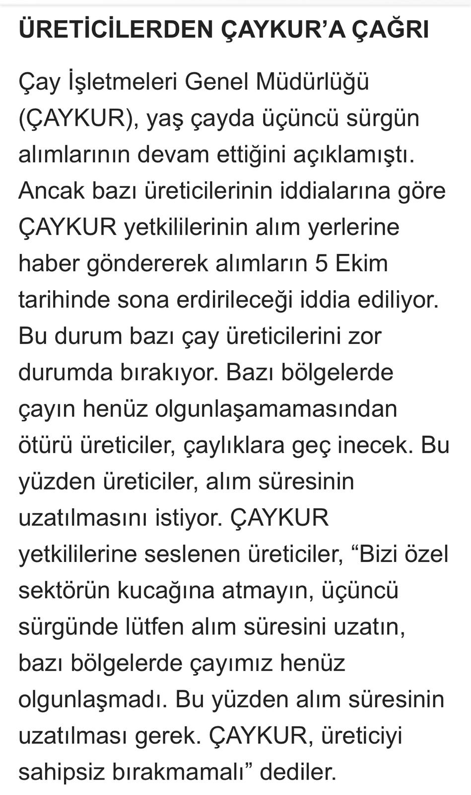 ÜRETICILERDEN ÇAYKUR'A ÇAGRI