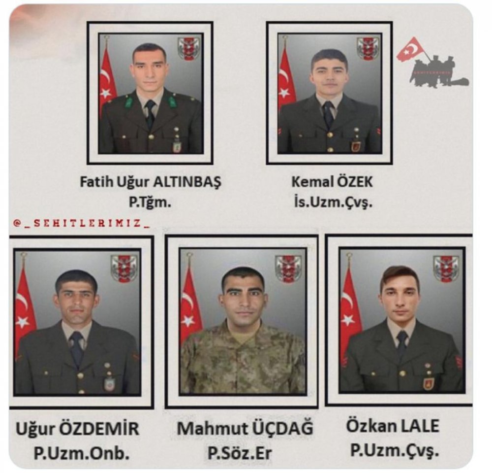 Pençe kilit operasyonu bölgesinde PKK’lı teröristlerle girilen çatışmada piyade teğmen Fatih uğur altunbaş, piyade uzman onbaşı uğur özdemir,İstikam uzman Çavuş Kemal Özek, piyade sözleşmeli er mahmut üçdal piyade uzman Çavuş Özkan lale şehit düştüler,Şehitlerimiz bugün yapılan devlet törenlerinin ardından memleketine toprağa verildi.