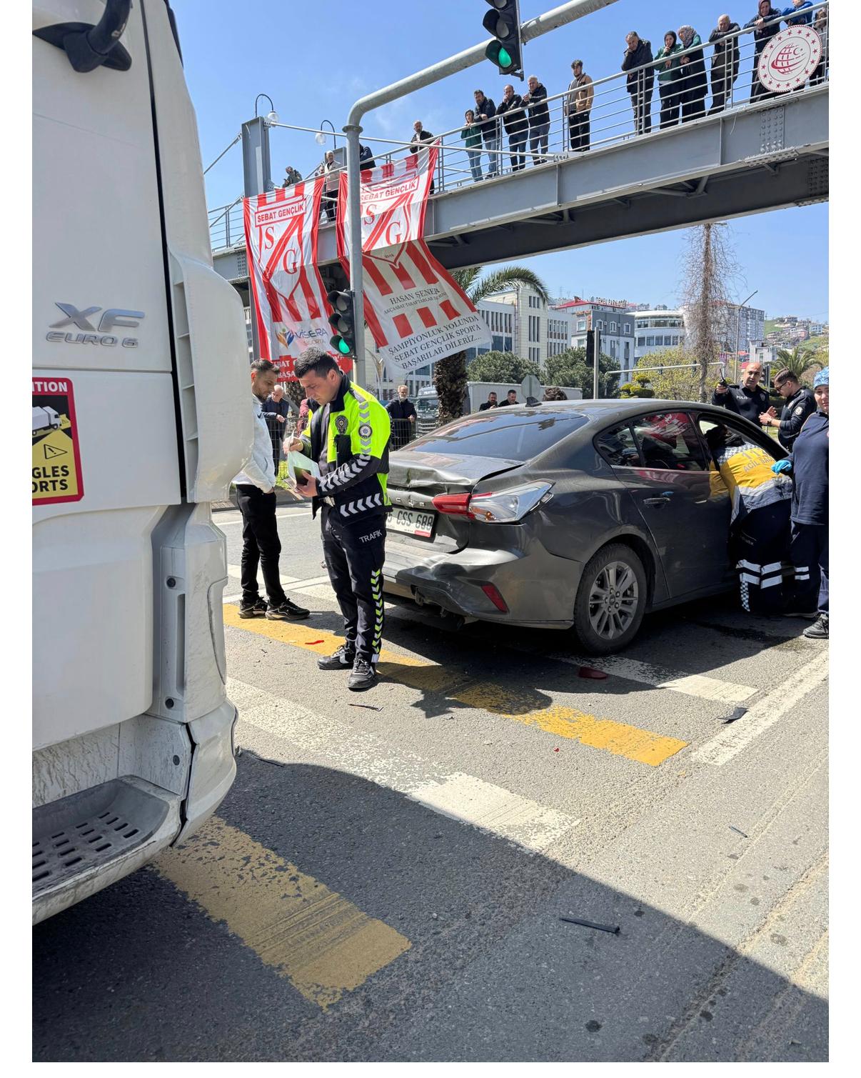 Akçaabat’ta trafik ışıklarında korkutan bir kaza yaşandı. Bir otomobil ve 2 tırın karıştığı kazada büyük çapta maddi hasar meydana geldi.
