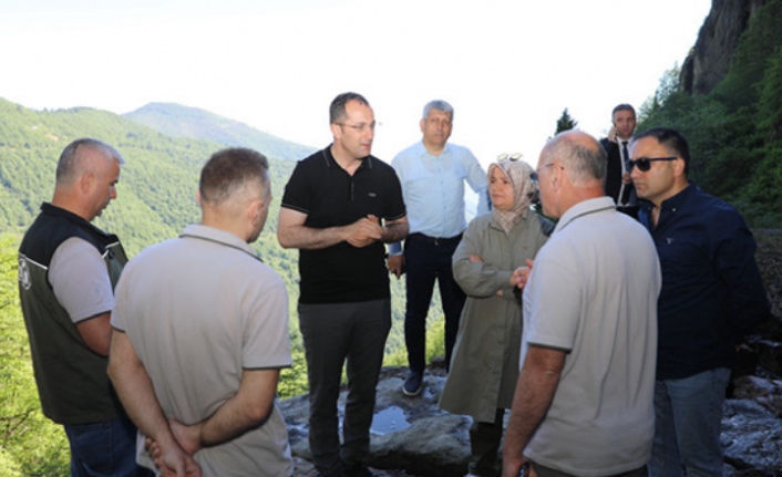 Hıdırnebi Yaylası esnafıyla yapılan toplantının ardından Akçaabat Kaymakamı Yusuf Cankatar, Akçaabat Belediye Başkanı Osman Nuri Ekim ve AK Parti Akçaabat İlçe Başkanı Muhammet Ali Yılmaz Uçarsu Şelalesi’ni incelediler.