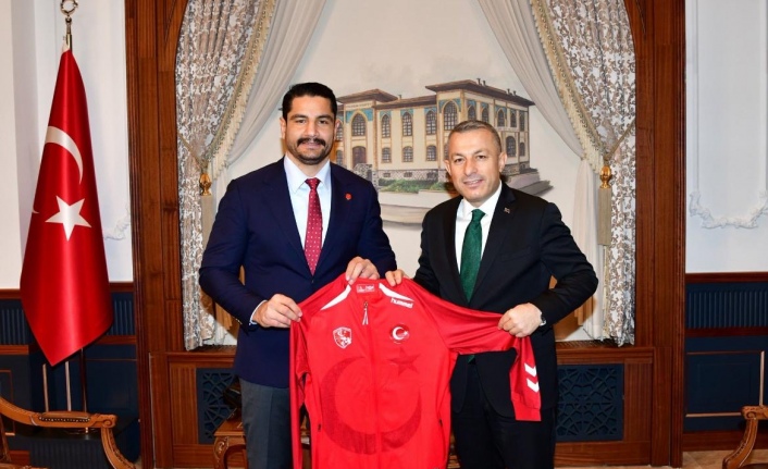 Trabzon Valisi Tahir Şahin’i Türkiye, Avrupa, dünya, olimpiyat şampiyonu güreş federasyonu başkanı Tahir Akgül ziyaret ederek kendisine milli formayı takdim etti.