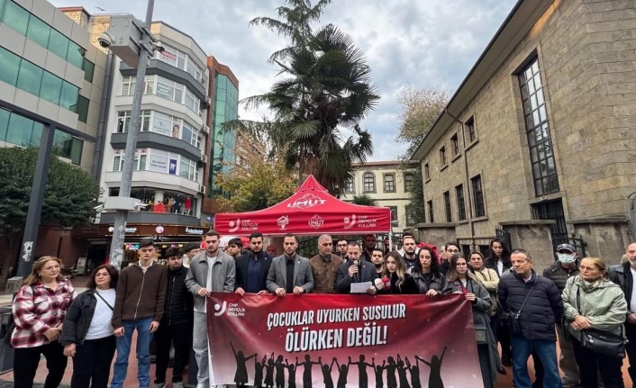 "mesleki egitim" adi altinda çocuklarimizi ucuz is gucu olarak sermayenin insafina terk ettigi bu duzende, son 11 yilda 690 çocugumuz, sadece bu yil ise 9 çocugumuz çalistiklari is yerlerinde is kazalarinda hayatini kaybetmistir. Asgari ücretin %30'una, günlük 200 liraya mahkûm edilen çocuklarimiz için "en azindan bir ögün yemegi devlet karsilasin" diyen ögretmen ve ögrencilerin gözaltina alinmasina kargi, Gençlik Kollarimizin basin açiklamasina katildik.