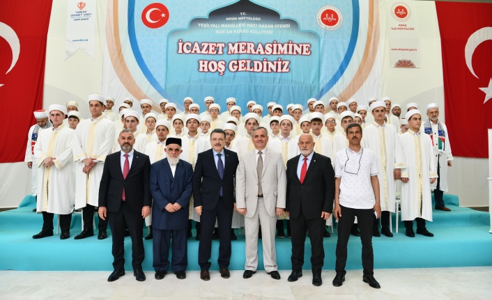 Trabzon Büyükşehir Belediye Başkanı Ahmet Metin Genç, Arsin Müftülüğü’nün düzenlediği Yeşilyalı Mahallesi Hacı Hasan Efendioğlu Kur'an Kursu’nun 42. döneminde mezun olan 87 öğrencinin İcazet Duası programına katıldı. Yeşilyalı Merkez Kur'an Kursu’nda düzenlenen törende Arsin Kaymakamı Ömer Sirkeci, Gaziantep İslam ve Bilim Teknolojileri Üniversitesi Rektörü Prof. Dr. Şehmuz Demir, Arsin Belediye Başkanı Hamza Bilgin, Trabzon İl Müftüsü Selami Aydın, din görevlileri ve çok sayıda öğrenci ile aileleri yer aldı. Güzel bir ibadetin içerisinde olduklarını belirten Başkan Genç, “Ne mutlu bize ki Cenab-ı Allah’ın, peygamber efendimiz arayıcılığıyla bize ulaştırdığı kutsal kitabımızı yeryüzüne yaymak için güzel bir ibadetin içerisindeyiz. Çok şükür ki şu anda ülkemizin her karış toprağında bu ibadetler rahatlıkla yapılabiliyor. Trabzon'umuzda 1461 hafızımızın icazet merasimini yaptık. Bizi bugünlere getiren Cenab-ı Allah'a hamdolsun” dedi.