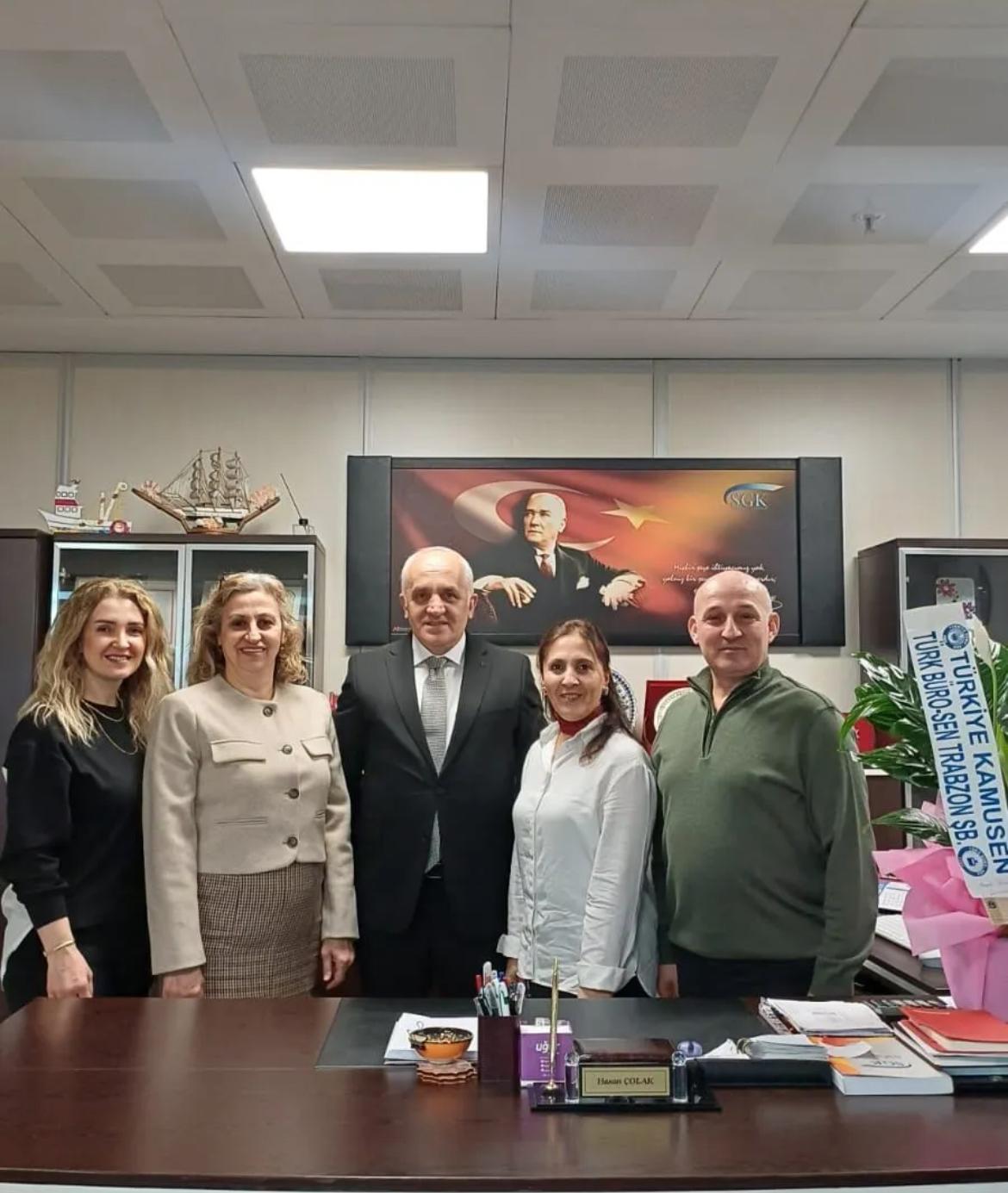 Geçirdiği kalp rahatsızlığı nedeniyle anjiyo olan ve kısa bir istirahat sürecinin ardından yeniden görevine dönen Karadeniz Sosyal Güvenlik Merkezi İl Müdür Yardımcısı Hasan Çolak'a geçmiş olsun ziyaretleri devam ediyor. Türk Büro-Sen Trabzon Şube Başkanı Emine Kaplan, Yönetim Kurulu Üyeleri Elvan Ustaoğlu ve Erol Sağlam ile işyeri temsilcisi Tuğba Sarıalioğlu, Hasan Çolak'ı ziyaret ederek geçmiş olsun dileklerini iletti ve acil şifalar temennisinde bulundu. Çarşıbaşı ilçesinin yetiştirdiği önemli değerlerden biri olan Hasan Çolak'ın; mütevazı kişiliği, güler yüzü ve çalışkanlığıyla her kesim tarafından sevilen ve takdir edilen bir şahsiyet.
