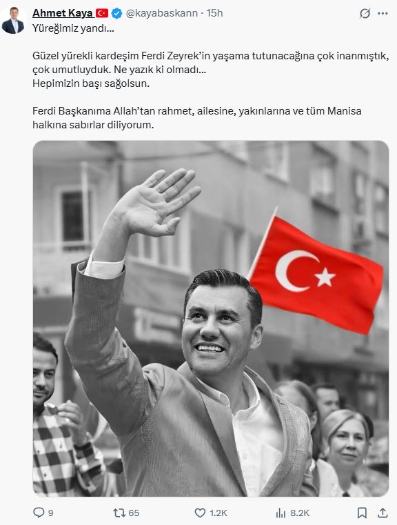 “Yüreğimiz yandı… Güzel yürekli kardeşim, Manisa Büyükşehir Belediye Başkanımız Ferdi Zeyrek’in yaşama tutunacağına çok inanmıştık, çok umutluyduk. Ne yazık ki olmadı… Bu acı kaybın derin üzüntüsünü yüreğimizde hissediyoruz. Hepimizin başı sağ olsun. Ferdi Başkanıma Allah’tan rahmet; ailesine, yakınlarına, Cumhuriyet Halk Partisi camiamıza ve tüm Manisa halkına sabırlar diliyorum.”