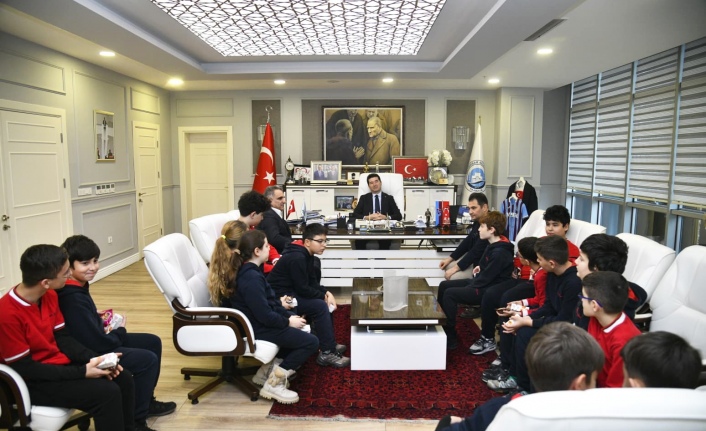 Amerikan Matematik Olimpiyatları’nda dereceye giren Bener Cordan Ortaokulu öğrencileri, Okul Müdürü İbrahim Soysal ve Müdür Yardımcısı İsmail Yurdusev ile birlikte Başkan Kaya’yı ziyaret etti. Bener Cordan Ortaokulu’nun 5 altın, 14 gümüş ve 10 bronz olmak üzere toplam 29 madalya kazandığını kaydeden Müdür Soysal, “Çocuklarımız bu başarılarıyla, Singapur Uluslararası Matematik Olimpiyatı Mücadelesi’ne (SIMOC) katılmaya ve ülkemizi temsil etmeye hak kazandılar” dedi.
