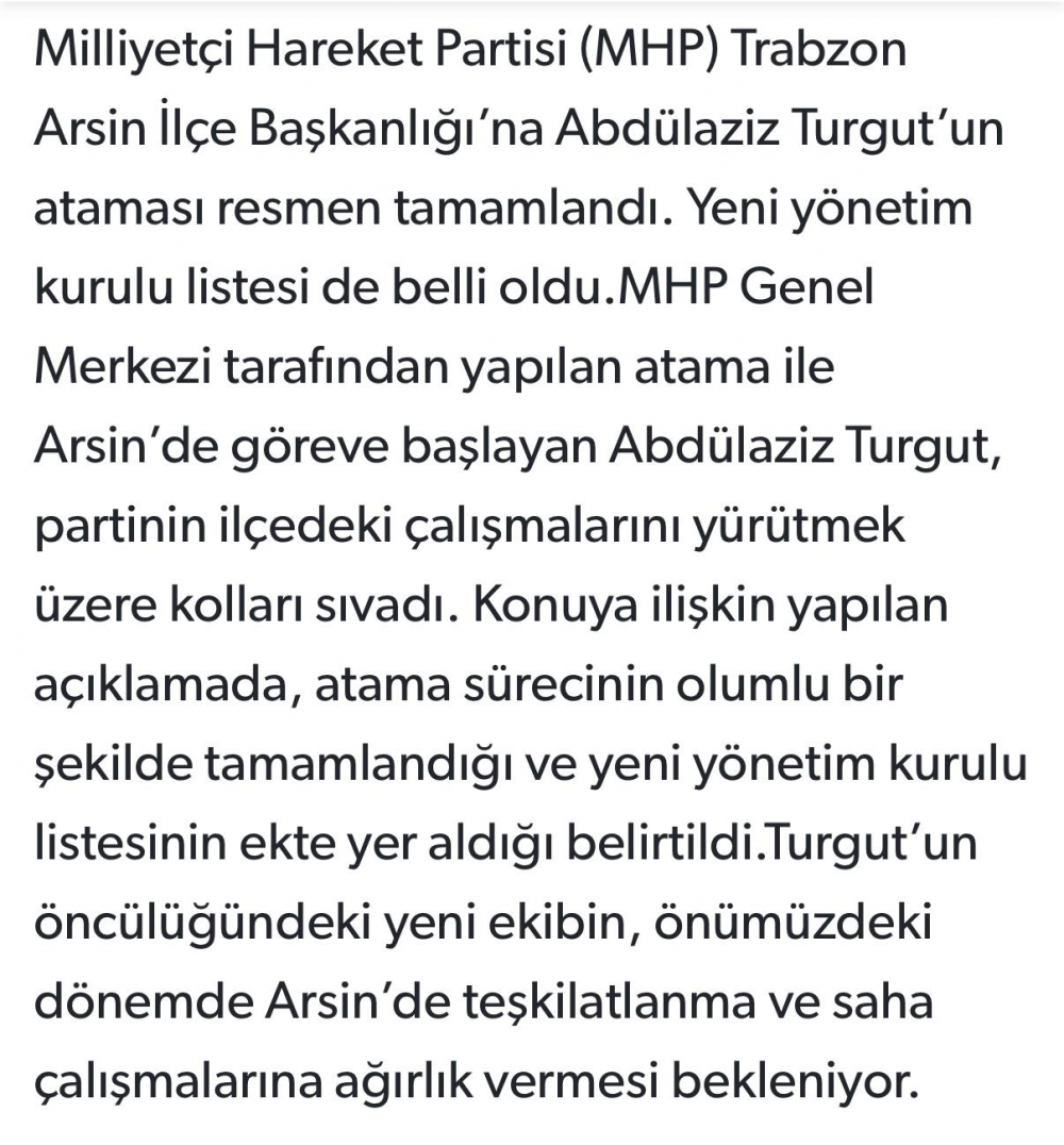 Başkan Sivrikaya Arsin il ilçe başkanlığına Turgut’u atadı.