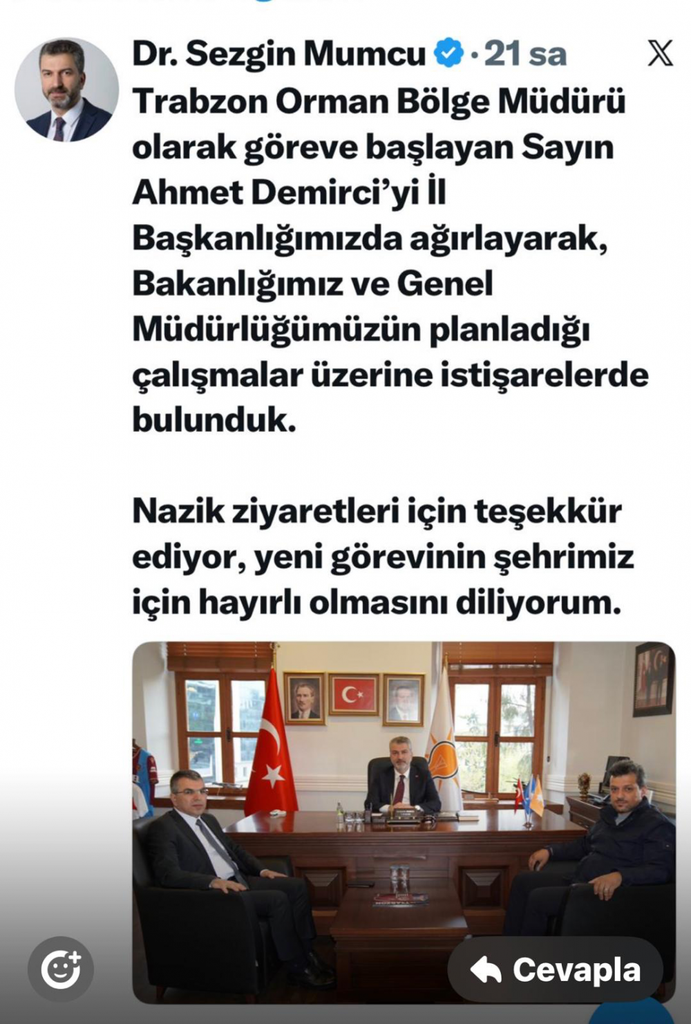 Denizli orman bölge müdür yardımcılığından Trabzon orman bölge Müdürlüğü’ne atanan Ahmet Demirci ilk olarak AK PARTİ il başkanı Sezgin mumcu‘yu ziyaret ederek göreve başlayacağını belirtti il başkanı Sezgin mumcu kendi sosyal medyasını da yaptığı açıklamada orman bölge Müdürlüğü’nü atanan Ahmet Demirci ilk olarak il başkanımızı ziyaret etmiştir açıklamasında bulundu