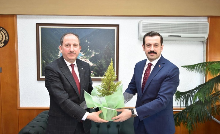 Orman Bölge Müdürü Emin Yılmaz’ı ziyaret eden Akçaabat Cumhuriyet başsavcısı Şeref Özsöğüt’e ormancılık haftası dolayısıyla fidan takdim etti, başsavcı Özsöğüt ise bölge müdürü Yılmaz’ın şahsında ormancılık haftasını kutladı.