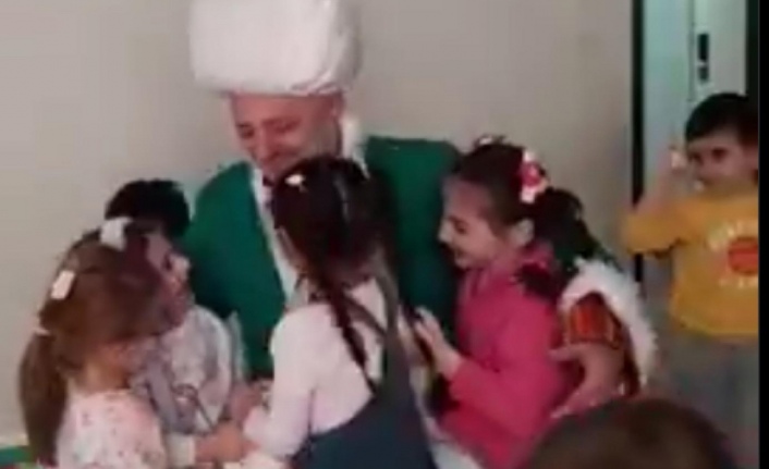 Yomra müftüsü Celal malkoç nasrettin hoca kılığına girerek kreşteki çocukları eğlendiriyor,Fırsat buldukça onlarla ilgilenmeyi çok seviyorum bu benim başta gelen görevlerim arasına girdi diyor.