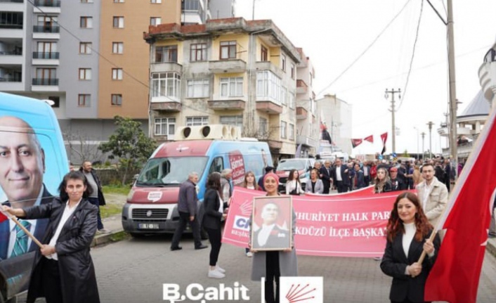 CHP Beşikdüzü belediye başkan adayı Cahit erdem ve gençler ellerinde Türk bayrakları flamalarla yaptıkları yürüyüş sırasında vatandaşlar tarafından alkışlandılar