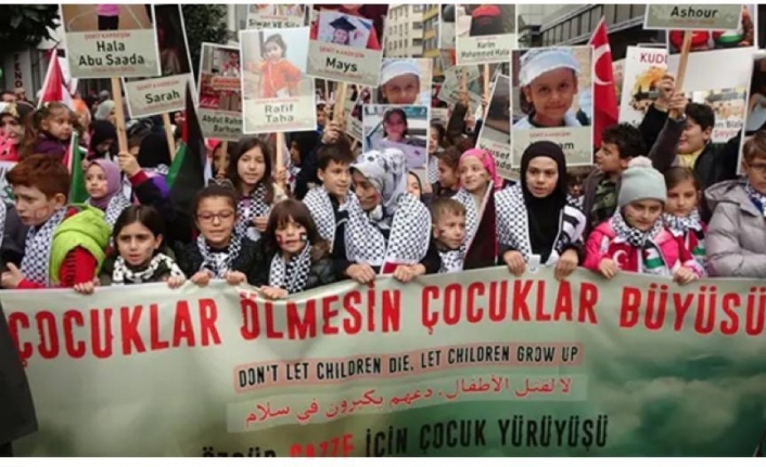 Trabzon Kahramanmaraş caddesinden Atatürk alanına kadar yürüyen çocuklar ölmesin çocuklar büyüsün pankartıyla 1000’e Yakın çocuk Filistin’e destek yürüyüşü yaptılar,Çocuklar uyurken sessiz olunur ölürken değil,Miraç’a Şahit kıldığın Kudüs’ün özgürlüğüne bizi de şahit kıl
