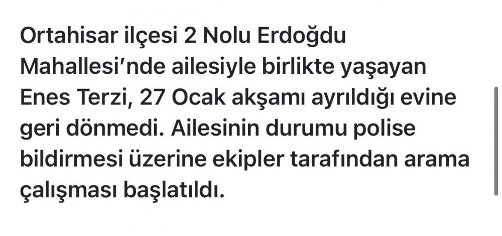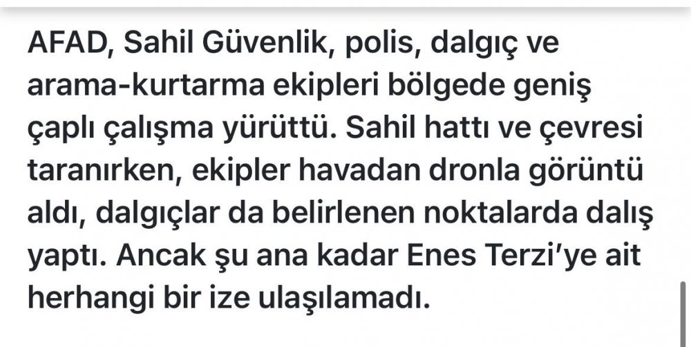 Enes Terzi’yi arama çalışmaları devam ediyor