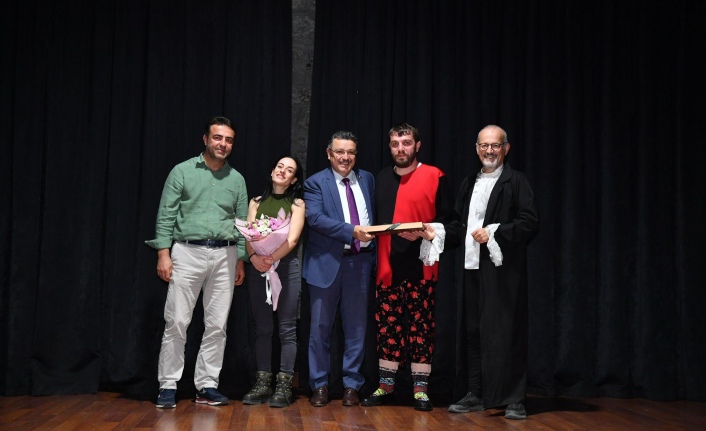 Başkan Genç, oyundan sonra sahneye çıkarak oyuncuları tek tek tebrik etti ve çiçek takdim