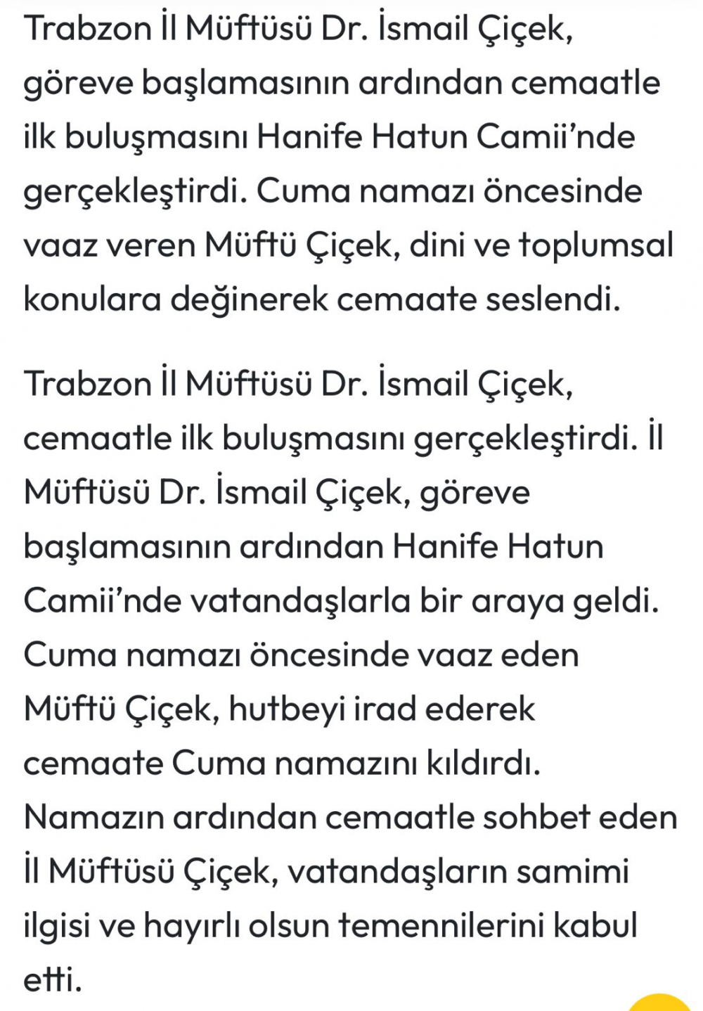 İl müftüsü Çiçek ilk vaazını Hanife Hatun Camii’nde verdi.