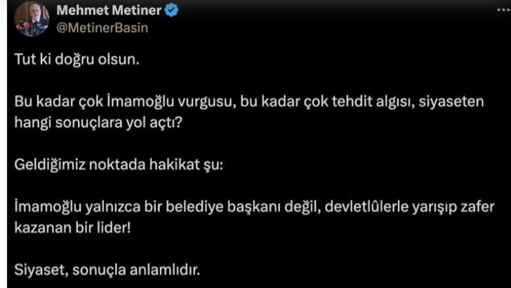 AK PARTİ eski milletvekili Mehmet metiner Tivitirin’de Ekrem İmamoğlu yalnız bir belediye başkanı değil devleti ile yarışıp zafer kazanan bir liderdir dedi.