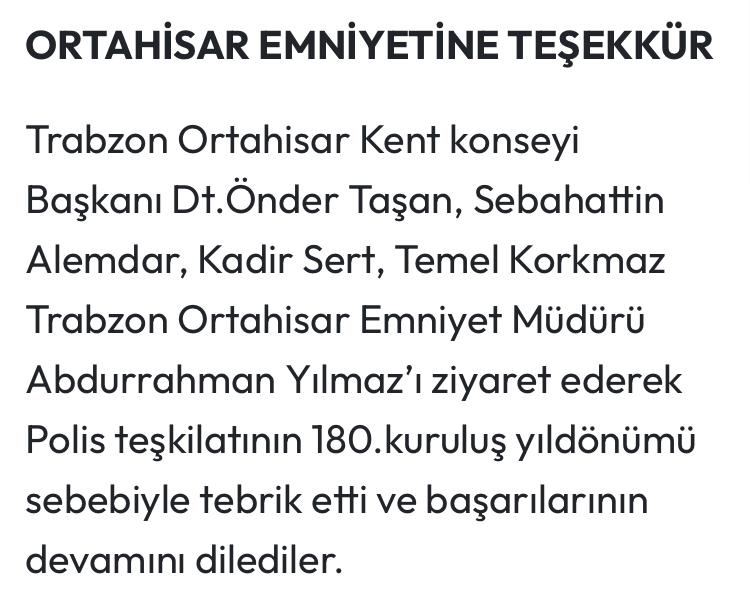 ORTAHISAR EMNIYETINE TESEKKÜR