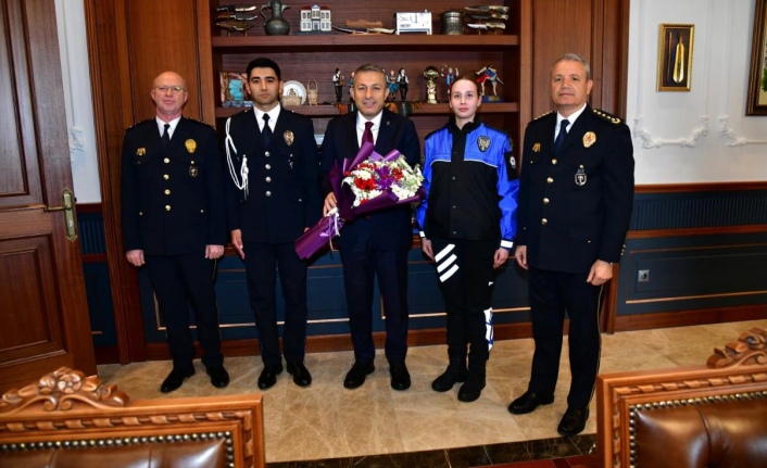Trabzon Valisi Tahir Şahin, Polis Meslek Yüksekokulu Müdürü İsmail Aktürk ve İl Emniyet Müdürü Ali Loğoğlu tarafından ziyaret edildi. Ziyaret, polis teşkilatının 181. kuruluş yıl dönümü ve 10 Nisan Polis Haftası dolayısıyla gerçekleştirildi. Çiçek takdim edilen Şahin’e, polis teşkilatına verdikleri destek için teşekkür edilirken, her zaman yanlarında olmaya devam etmelerini bekledikleri vurgulandı.