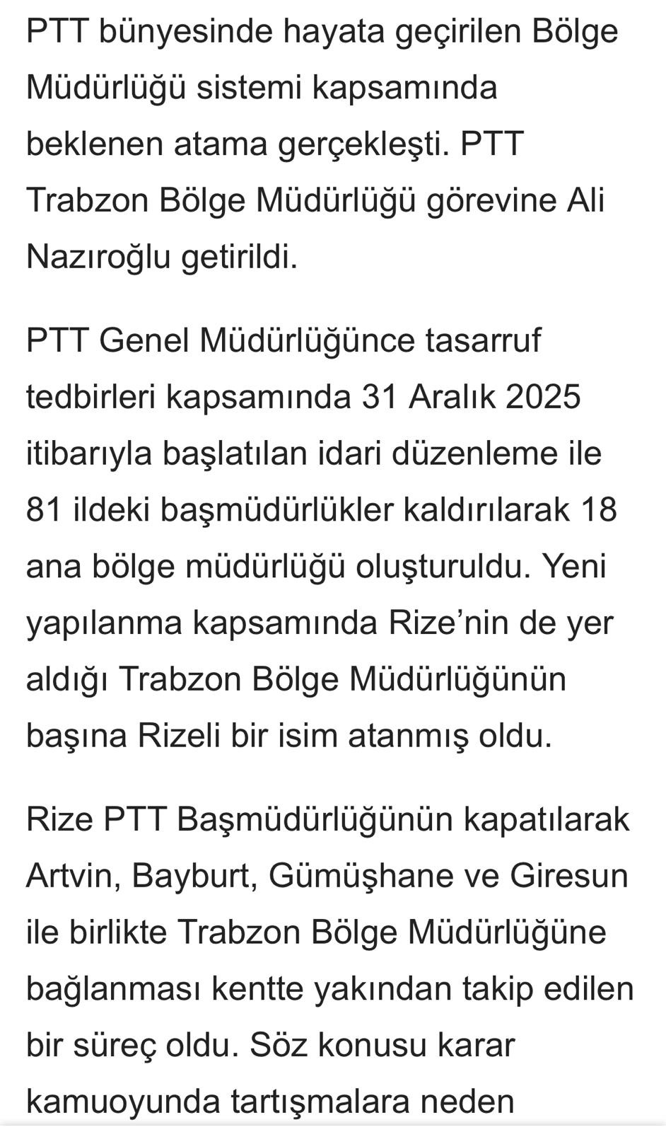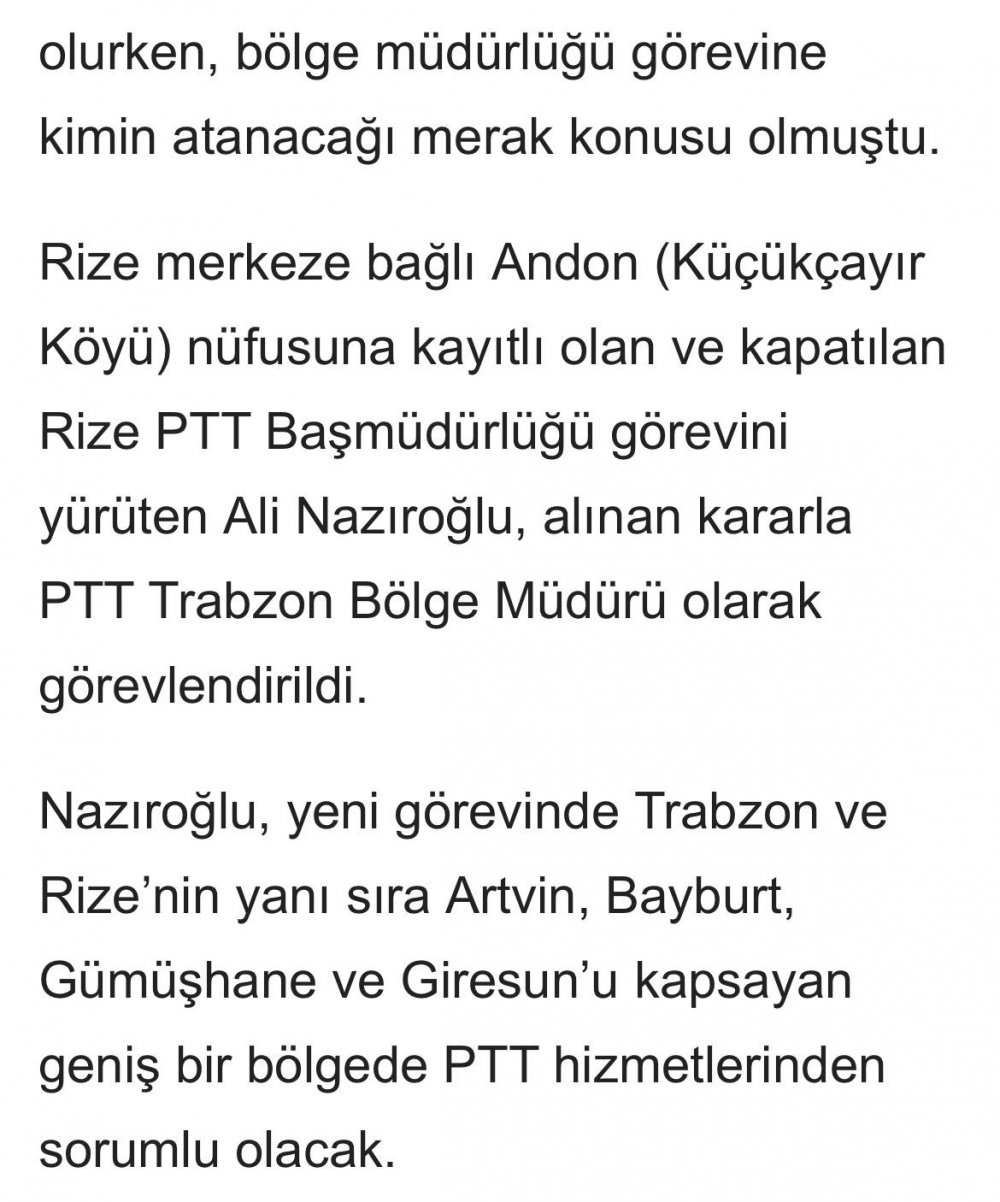 PTT bölge Müdürlüğü’ne Rizeli nazıroğlu atandı.