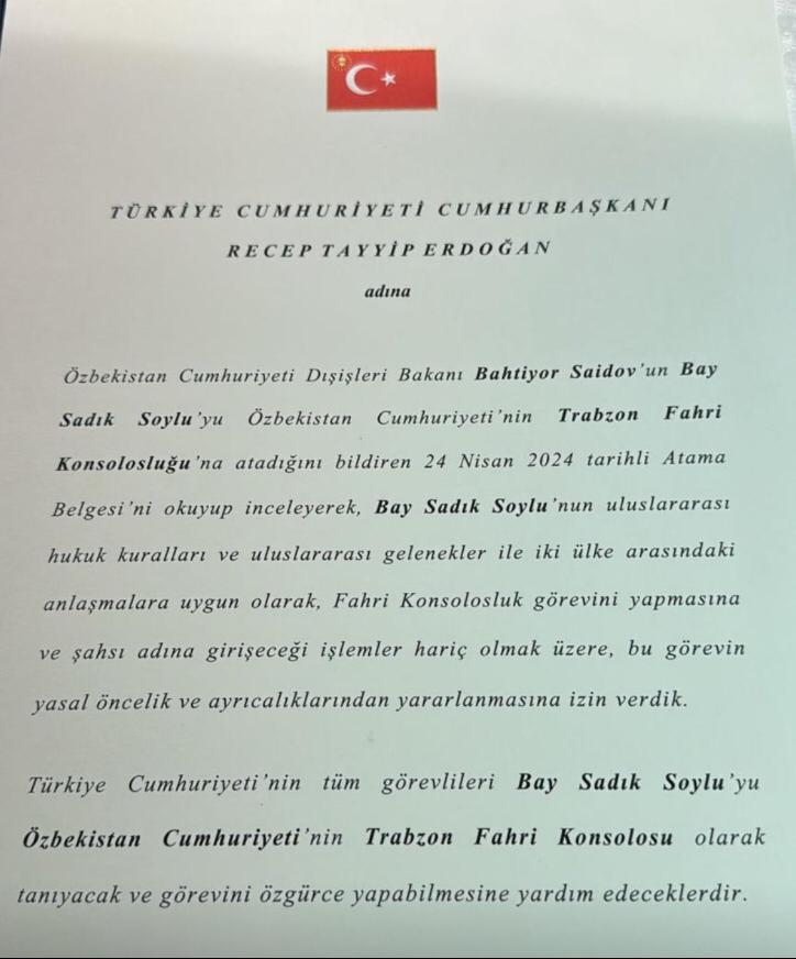 Çevre ve İklim Değişikliği eski Bakanı Sadık Soylu,Özbekistan Cumhuriyeti Trabzon Konsolosu oldu.Özbekistan Cumhuriyeti’nin bağımsızlığının 33. yıl dönümü olan 9 Eylül de Trabzon konsolosluğunun açılışının yapılacağı Törene Ankara büyükelçisi Azamhocayev’inde katılacağı belirtildi.