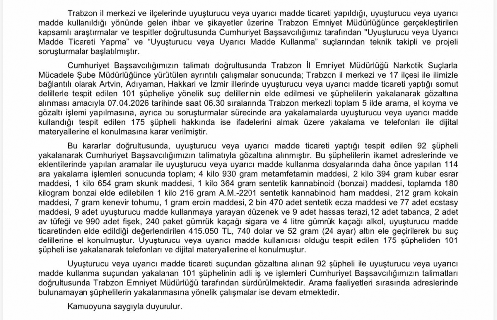 Trabzon polisinden hava destekli narkotik operasyonu 101 kişi gözaltında.