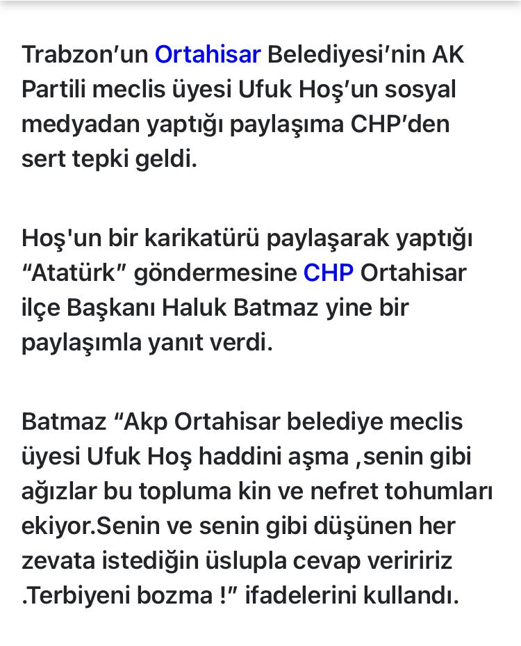 Trabzon'un Ortahisar Belediyesi'nin AK Partili meclis üyesi Ufuk Hog'un sosyal medyadan yaptigi paylasima CHP'den sert tepki geldi.