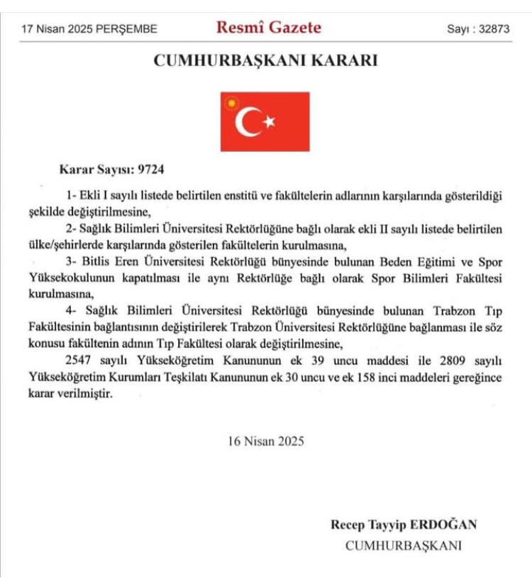 Cumhurbaşkanı Recep Tayyip Erdoğan’ın imzaladığı kararname ile İstanbul’daki Sağlık Bilimleri Üniversitesine bağlı olarak eski Numune Hastanesi yerleşkesi içinde kurulan 5 yıldır Trabzon Tıp Fakültesi olarak hizmet veren dekanlık Trabzon Üniversitesine bağlanarak Tıp Fakültesi Dekanlığı oldu bu durumda Akyazı’da yeni yapılan Şehir Hastanesi Trabzon Üniversitesine bağlı olarak hizmet vereceği resmileşti.