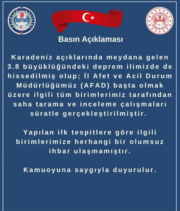 Trabzon Valiliği, deprem sonrasında yaptığı açıklamada, il Afet ve Acil Durum Müdürlüğü (AFAD) başta olmak üzere ilgili tüm birimlerin saha tarama ve inceleme çalışmalarına hızla başladığını duyurdu.