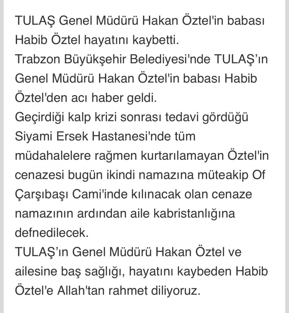 TULAŞ Genel Müdürü Hakan Öztel’in Babası Habib Öztel’e Son Görev