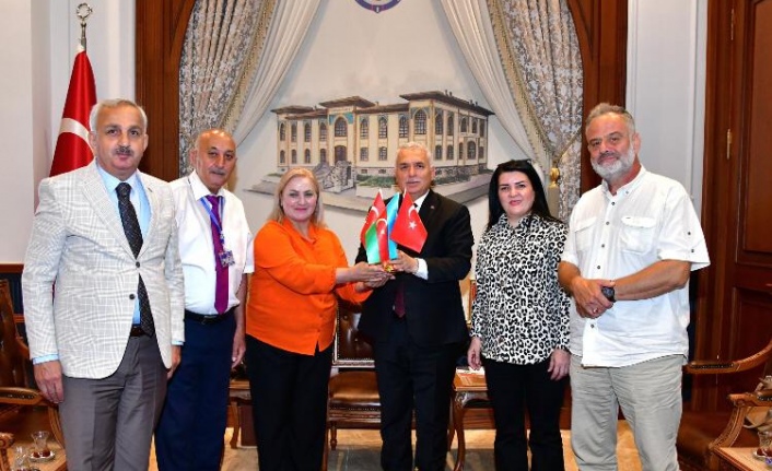 Azerbaycan-Türk Halkları Kardeşliği İçtimai Birliği Başkanı Doç.Dr.Sakine Bayramova,Turan Elçiler Teşkilatının Azerbaycan Akademik Kurul Başkanı Doç.Yegane Kahramanova,Birlik Muavini Hacı İlham Kurbanoğlu ve TÜRKAV Başkanı Kenan Kuru Vali Aziz Yıldırım'ı ziyaret etti.