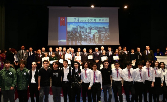 24 Şubat Trabzon’un kurtuluşu’nun 106. yıldönümünde Hamamı ihsan bey kültür Merkezi’nde Düzenlenen yarışmalarda dereceye girenler ödüllerini Trabzon Valisi Aziz Yıldırım,Ortahisar kaymakamı gürkan demir kale,emniyet müdürü Murat esentürk, jandarma alay Komutanı tuğgeneral Mustafa erdem, il milli eğitim müdürü Hasan uygun ve Öteki ilgililer takdim ettiler.