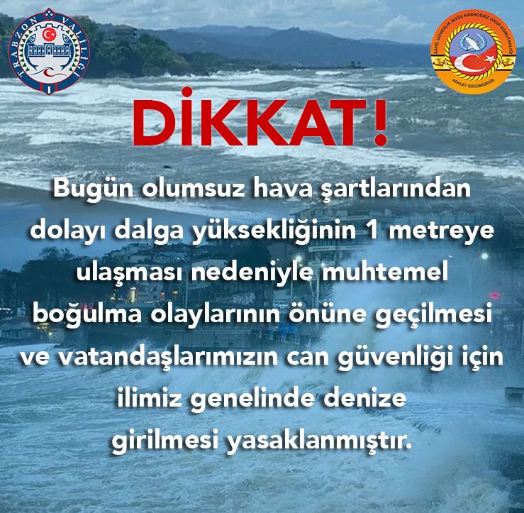 Trabzon Valiliği, dalga yüksekliğinin 1 metreyi aşması nedeniyle bugün il genelinde denize girmenin yasaklandığını duyurdu.