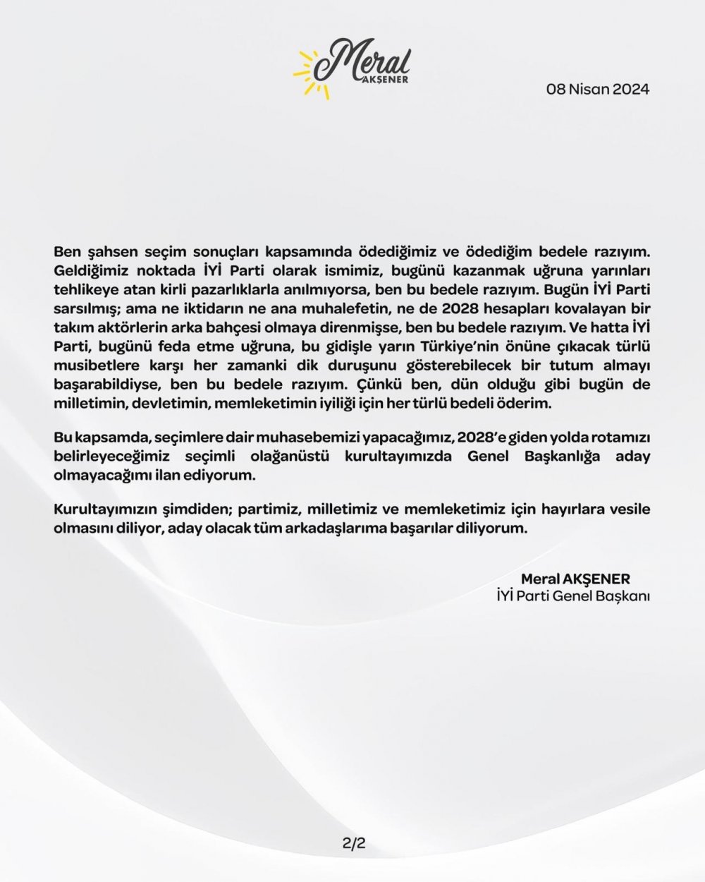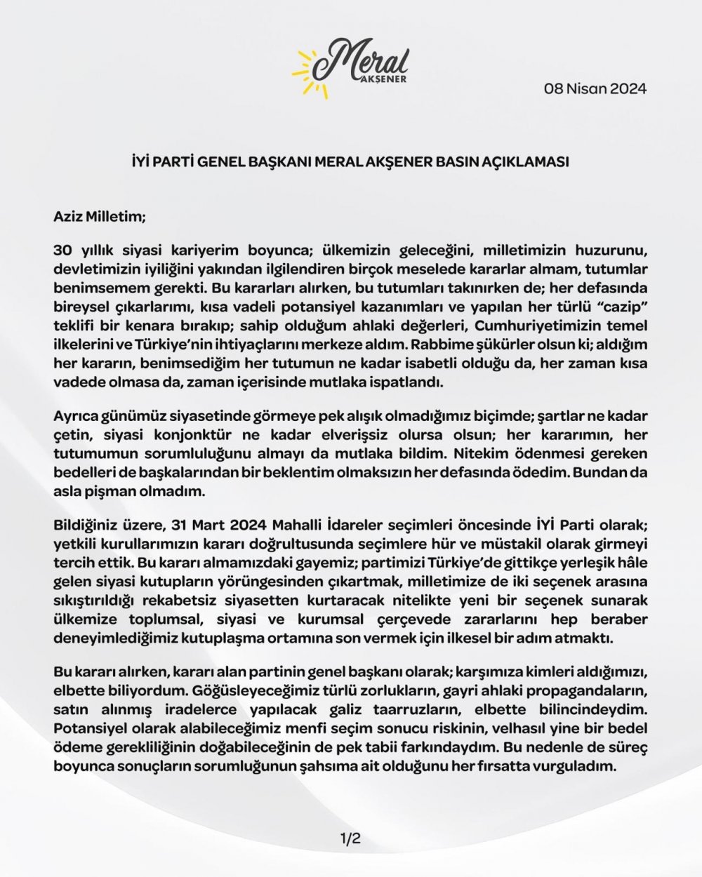 İYİ Parti Genel başkanı Meral Akşener yayınladığı yazılı açıklamasında
