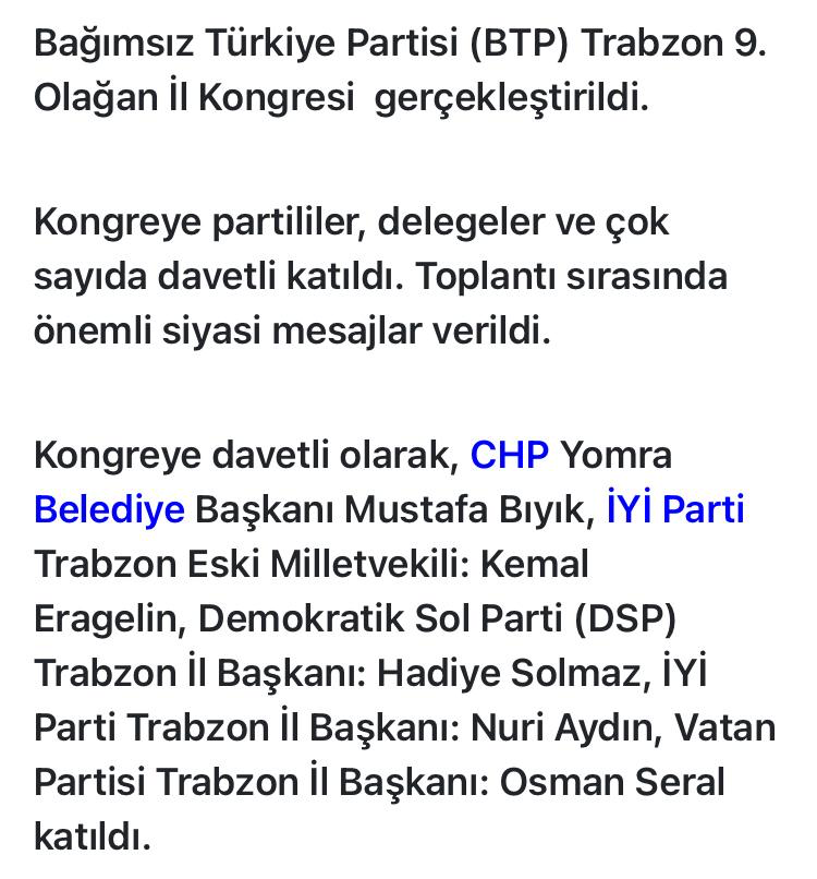 Bağımsız Türkiye Partisi (BTP) Trabzon 9. Olağan İl Kongresi gerçekleştirildi.