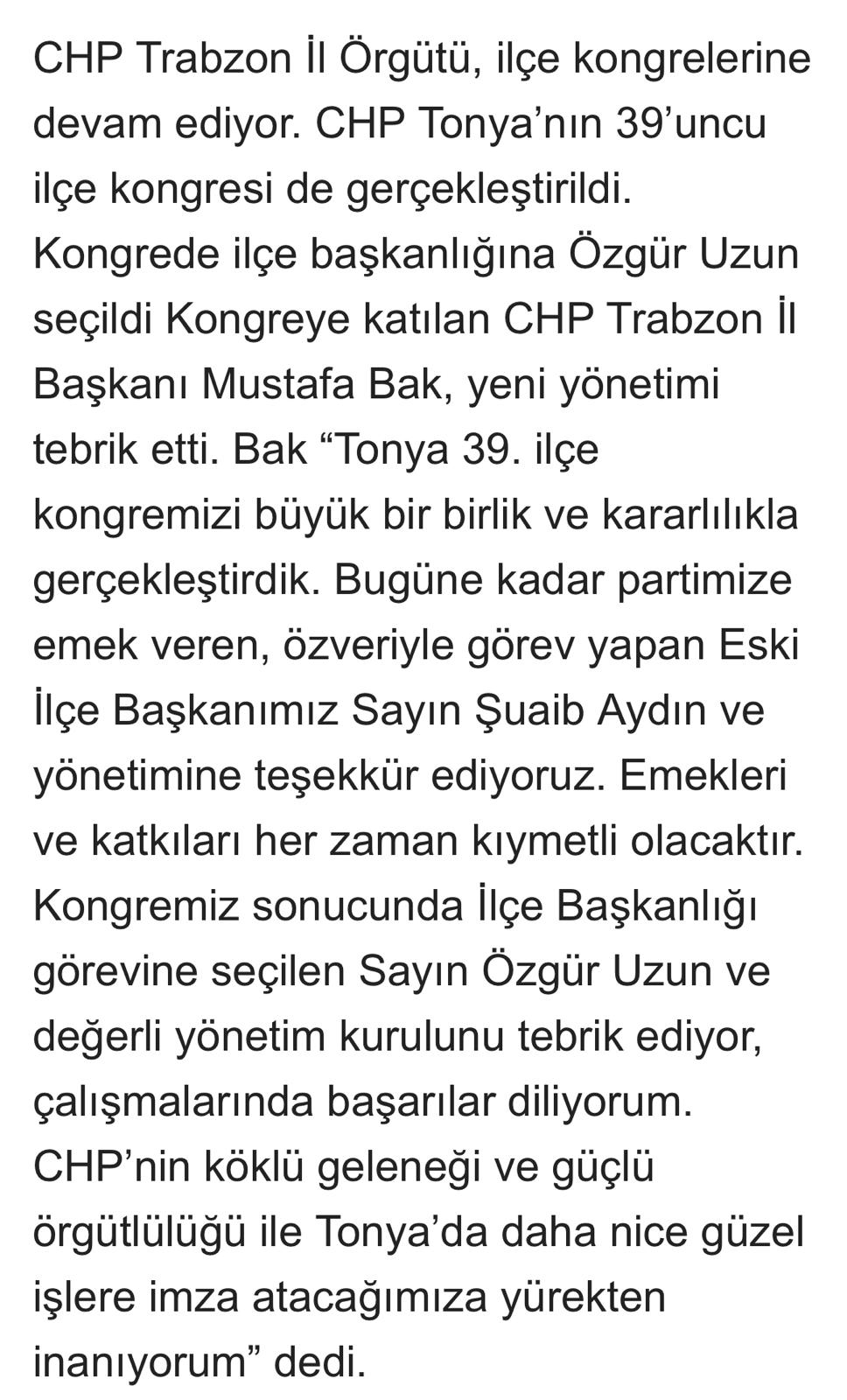 CHP tonya ilçe başkanlığına Özgür uzun seçildi.